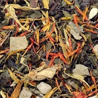 Delicada mezcla de té verde con frutas tropicales, frutas silvestres y delicioso aroma afrutado. Ingredientes: Té verde con papaya, piña, moras negras, fresas, pétalos de rosas y aroma natural.